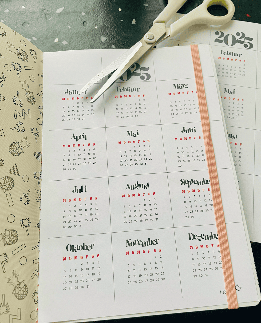 Einen kleinen Jahreskalender für 2025 ausdrucken? Gerne! Hier kriegst du direkt zwei im A5 Format. Die Kalender-Vorlagen, die allesamt alle 12 Monate mit Tagen zeigen, kannst du in verschiedenen Versionen wählen, falls jemand lieber pink, blau, curry, oliv, oder unifarben grau haben will. Wir haben ihm den Namen „Jump“ verpasst, weil die Schrift so schön hüpft.