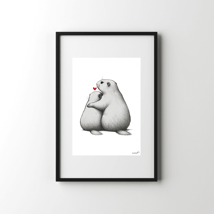 Wie wäre es mit einem echten Knuddelfaktor für die Wand? Unser Murmeltierpaar kuschelt sich von hinten aneinander, und – wie könnte es anders sein – ein kleines Herz schwebt über ihnen. Ob als originelles Geschenk zum Valentinstag oder als süße Überraschung zwischendurch, das Miniposter sorgt garantiert für ein Lächeln!