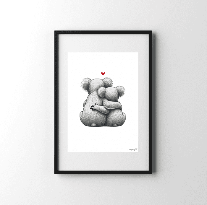 Bereit für eine kuschelige Liebesgeschichte aus dem Eukalyptuswald? Unser Koala-Paar zeigt sich von hinten, wie sie entspannt aneinanderlehnen, mit einem Herz, das ihre flauschige Zuneigung perfekt abrundet. Die kleinen Romantiker wissen eben, wie man chillt – und lieben kann! Ideal für alle, die auf süße Tiermotive stehen und etwas Liebe in ihr Zuhause bringen möchten.