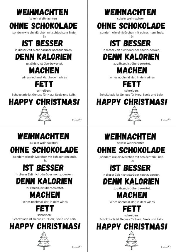 Du suchst nach lustigen Weihnachtskarten zum Ausdrucken? Dann haben wir genau die richtige Vorlage für dich! Den Spruch „Weihnachten ohne Schokolade“ gibt es sonst nirgendwo, denn er ist unserem Hirn entsprungen… War gar nicht so einfach, denn die fett gedruckten Worte müssen ja einen Sinn ergeben und werden dann durch die Zwischenzeilen zum Ganzen Weihnachtsgruß!