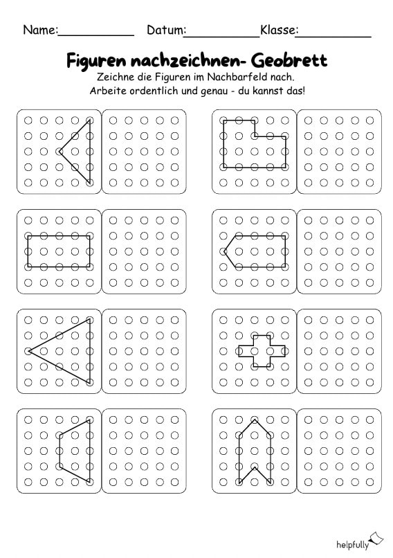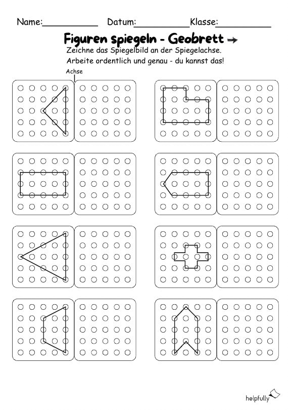 Mathe? Na klar – heute mal mit Geometrie! Unsere Vorlagen bringen Ordnung und Spaß in den Matheunterricht der Grundschule! Perfekt für kleine Einsteins: Die ersten beiden Vorlagen zeigen Figuren auf Geobrettern, die an der Achse zur Seite oder nach unten gespiegelt und nachgezeichnet werden können – ein ideales Training für die Auge-Hand-Koordination und das Verständnis von Symmetrie.