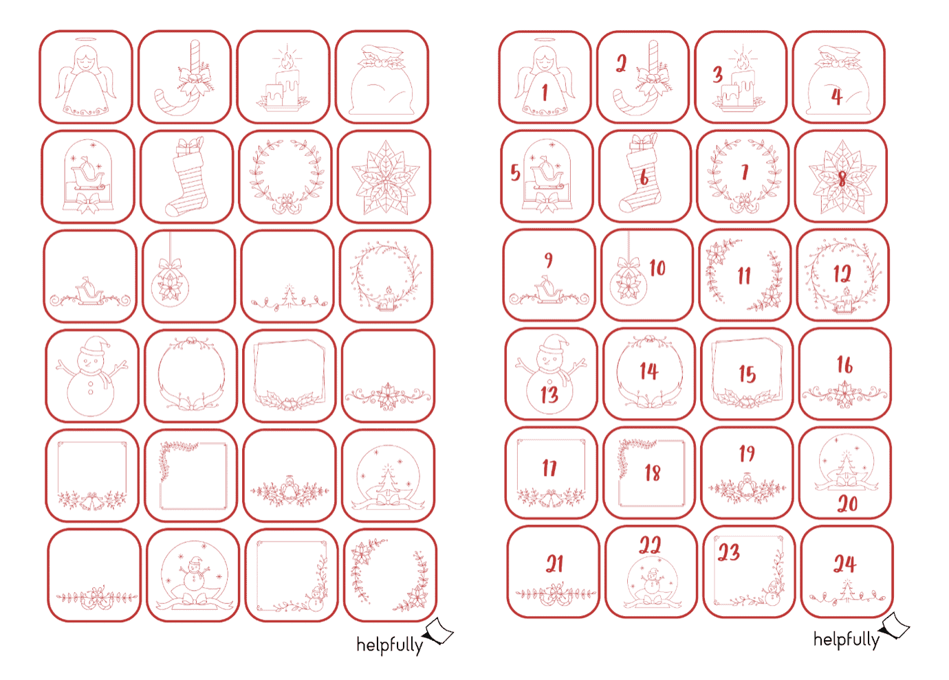 Die Vorlage mit den klassischen Weihnachtsmotiven und Adventskalenderzahlen ist ruckzuck ausgedruckt! Du kannst die 24 „Sticker“ in rot oder weiss vorher gerne noch ausmalen und individuell verzieren und so noch mehr individuellen Weihnachsflair versprühen, ist ganz deinem Geschmack überlassen!