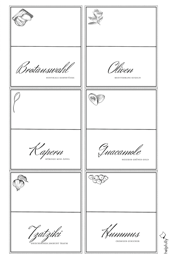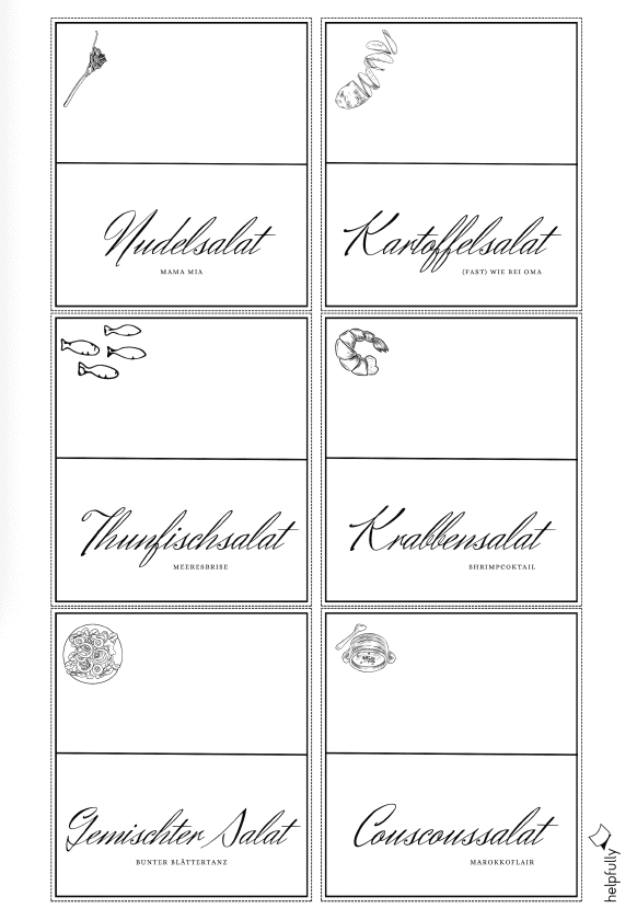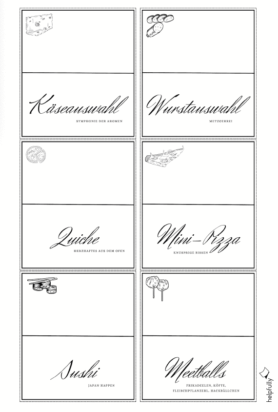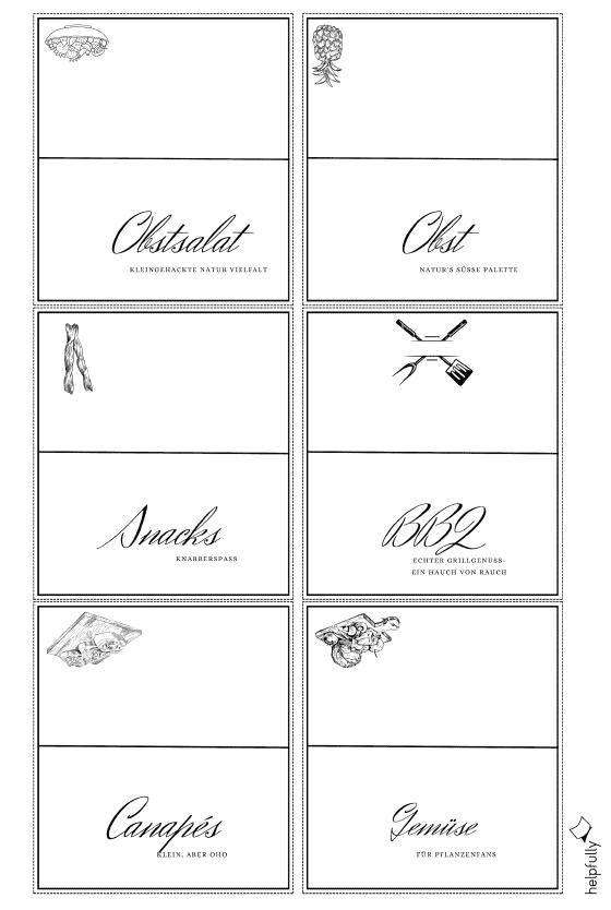 Also schnapp dir deinen Drucker, die Schere, folge den Hilfslinien und lass mit den befüllten Buffetkarten-Kreationen die Party, das Essen und die Bar rocken! 🎉✂️ Exklusiv bei helpfully.de!