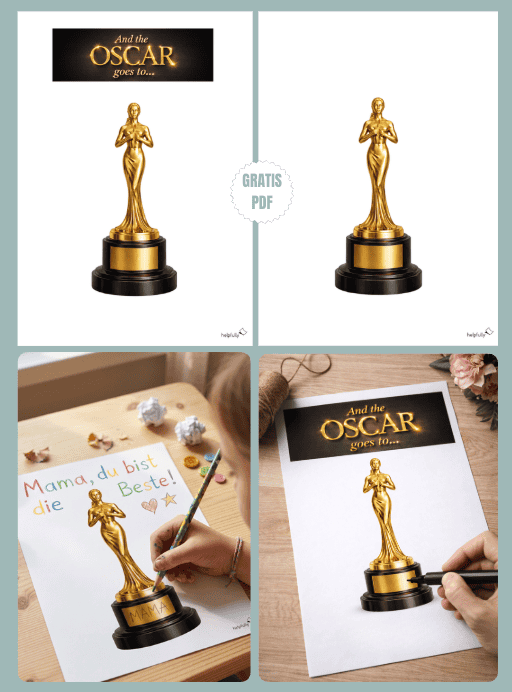 Zwei Versionen stehen bereit: eine mit dem goldenen Schriftzug „And the Oscar goes to…“ oben drauf, eine ganz cleane, perfekt, wenn du selbst noch etwas draufschreiben oder gestalten willst. Unten auf dem Sockel ist Platz für den Namen der geehrten Lady!