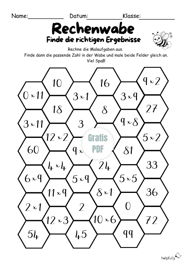 Fleißig wie die Bienen: Das Arbeitsblatt „Rechenwabe“ zur Multiplikation! Das kleine Einmaleins ist der Schlüssel für die Welt der Zahlen. Mit der „Rechenwabe“ von helpfully wird das Üben der Malfolgen zu einer bunten Entdeckungsreise. Das Blatt ist ideal für Kinder in der 2. und 3. Klasse, die Sicherheit beim Multiplizieren gewinnen wollen.