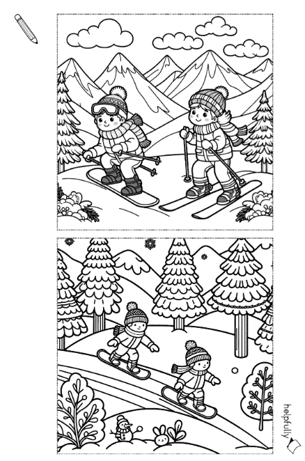 Skifahren und Snowboarden ist ein großer Spaß und beliebter Wintersport, auch beim Ausmalen! Die Malvorlage zeigt zwei Winterszenen, die Kindern hoffentlich die Zeit vertreiben, wenn in der warmen Stube gebastelt wird. Du kannst die kostenlosen Ausmalbilder einfach als PDF runterladen, ruckzuck ausdrucken, die Kids die Stifte zücken und schon kann’s losgehen mit dem winterlichen Malspaß!