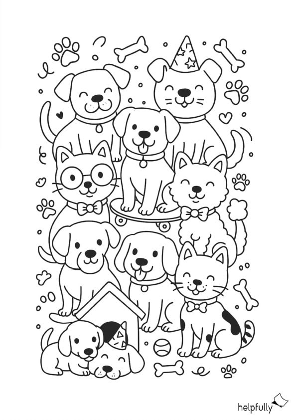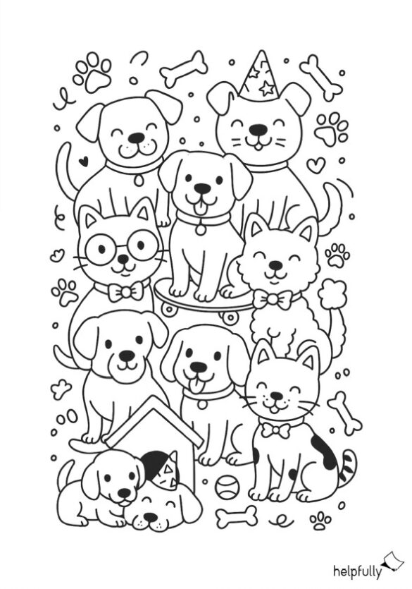 Lustige Malvorlage mit Hunden und Katzen zum Ausdrucken