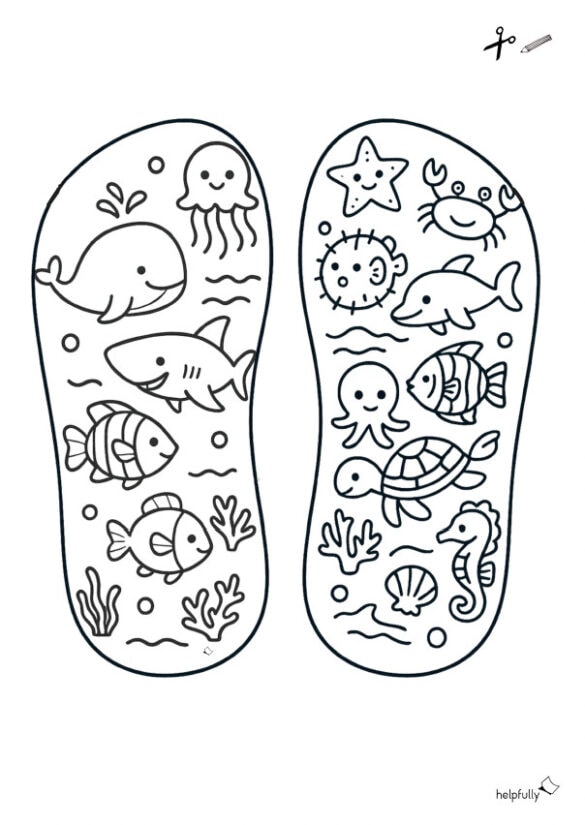 Die Flip-Flop-Vorlage mit Meerestieren zum Basteln und Ausmalen ist so spritzig, dass selbst der Wal auf der Sohle lächelt! Mit Hai, Qualle, Schildkröte, Krabbe & Co. tummelt sich hier eine kunterbunte Unterwassercrew, die nur darauf wartet, von den Kindern in Szene gesetzt zu werden.