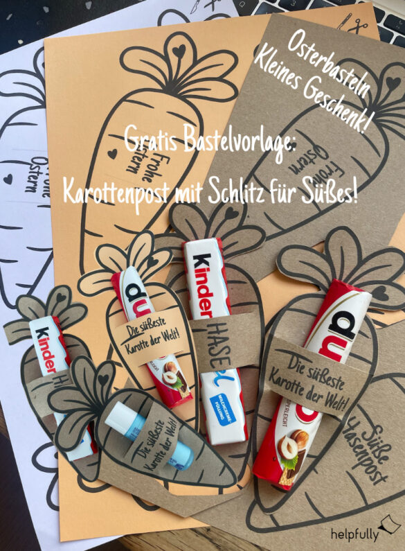 Diese Bastelidee funktioniert ganz einfach: Vorlage ausdrucken (entweder die mit Text oder die ohne, diese Seite beim Druck wählen), ausschneiden, Schlitz einschneiden (Vorsicht auf die Hände), befüllen – fertig ist deine süße Karottenpost!