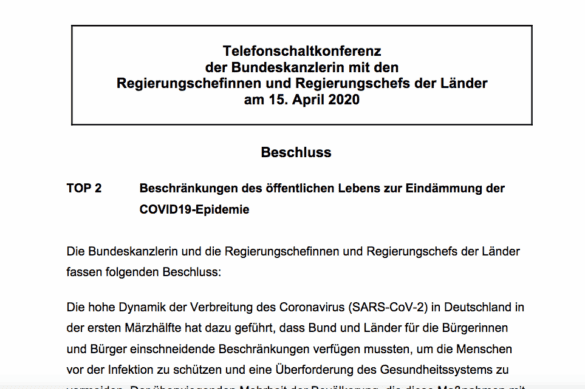 Bei der Telefonschaltkonferenz der Bundeskanzlerin mit den Regierungschefinnen und Regierungschefs der Länder am 15. April 2020 wurde folgende Beschlüsse gefasst: