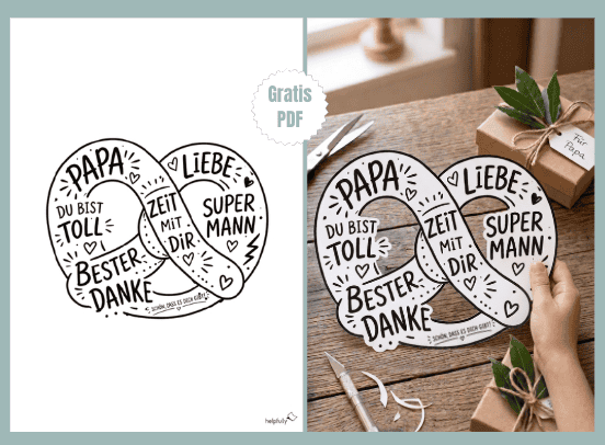 Druckt beide Vorlagen aus (Bierkrug und Brezel), bastelt sie zusammen mit den Kids und überreicht sie Papa als unschlagbares bayerisches Duo. Das ist „flüssiges Brot“ und „herzlicher Snack“ in einem – 100% Papa-Liebe! Holt euch jetzt die Gratis-PDF-Vorlage und macht eurem Papa eine Riesenfreude. Erstellt mit viel Liebe zum Detail (und Hunger auf echte Brezeln) von helpfully!