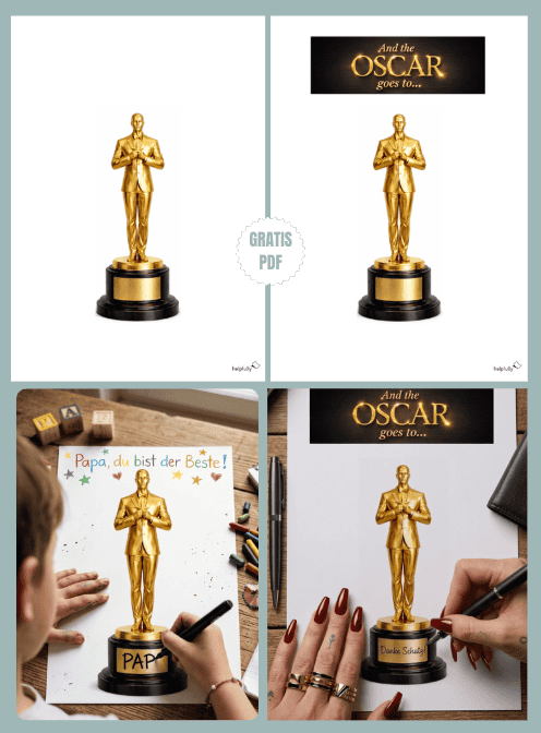 Zwei Versionen: einmal mit dem goldenen „And the Oscar goes to…“-Schriftzug, einmal clean zum selbst Beschriften. Unten auf dem Sockel ist Platz für den Namen. Auf A4 ausdrucken, und sogar der Heimdrucker liefert richtig ab.
