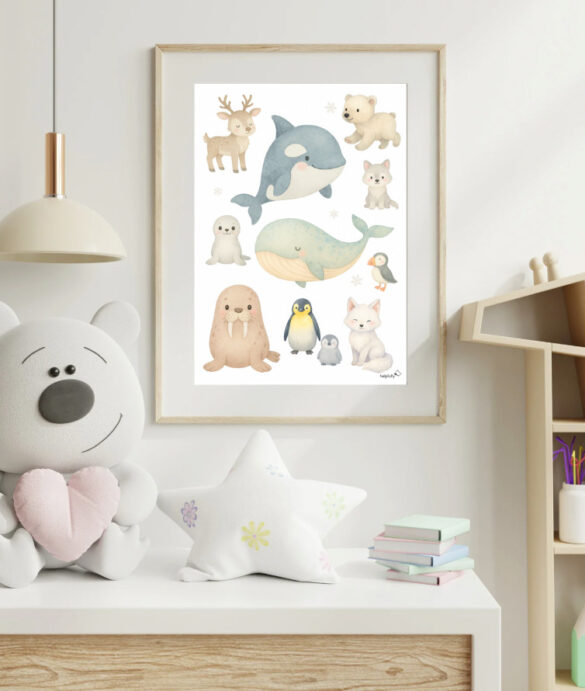 Einmal Arktis zum Ausdrucken – leise, warm und voller Freundlichkeit. Das Kinderposter vereint unsere pastelligen Aquarell-Lieblinge: Wal, Orka, Robbe, Walross, Pinguin, Karibu, Polarwolf, Papageitaucher und Polarfuchs, liebevoll illustriert, weich in den Farben und so sanft, dass man fast das knirschende Eis hört. Es ist das perfekte Tierposter für Baby- und Kinderzimmer, Wartezonen in Arztpraxen, Kitas oder Kinderstationen: beruhigend fürs Auge, inspirierend für kleine Entdecker:innen, und ein schöner Anlass, über die Arktis und ihre bedrohten Tiere zu sprechen.