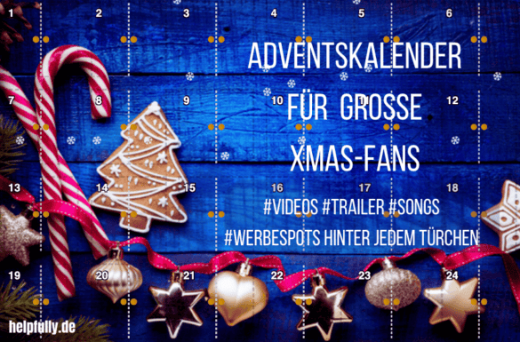Jeder Geschmack ist anders, aber für uns gibt es Weihnachtsklassiker, die zu Weihnachten gehören, wie das Happy-End zum Märchen. In unseren digitalen Adventskalender haben wir also 24 Songs, Trailer und Werbesports gepackt, die zur Winter-Weihnachtszeit für uns ein Muss sind. Sei es, weil es Tradition ist, sei es, weil es uns emotional berührt, weil es uns mit jemand verbindet oder weil die Stimmung einfach passt… Also, öffne ab dem 1. Dezember jeden Tag ein neues Türchen, lass‘ Dich überraschen und von XMAS-Vibes verzaubern! Selbstverständlich kannst du den Adventskalender auch via WhatsApp mit anderen großen Weihnachtsfans teilen und so jeden Tag eine kleine Überraschung schenken, denn gute Stimmung verbreiten, ist doch schon mal ein perfekter Start in die Winter-Weihnachtszeit ♥ Wir wünschen Dir und Deinen Liebsten einen tollen Dezember, mit Ruhe, dem ganz normalen Chaos-Wahnsinn, Glühwein, Christkindlmarkt, Plätzchenduft, genug Zeit zum Christmasshoppen und Basteln, gemütlichen Stunden mit Freunden und Familie sowie Zeit für Dich. Eine gesunde und besinnliche Vorweihnachtszeit, helpfully