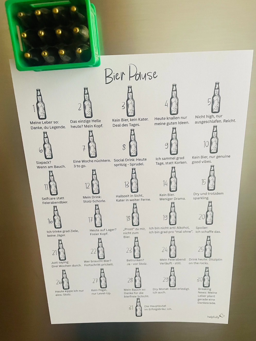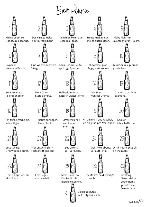 Einfach die Bier-Pause-Vorlage von helpfully ausdrucken, in Sichtweite aufhängen, jeden Tag den passenden Spruch lesen, eventuell abhaken und dich kurz feiern: fürs Durchhalten, fürs „Heute mal anders“. Ob du tageweise, eine Woche oder den ganzen Monat mitmachst, bleibt komplett dir überlassen – die Papier-Flaschen sind da, wenn du sie brauchst.