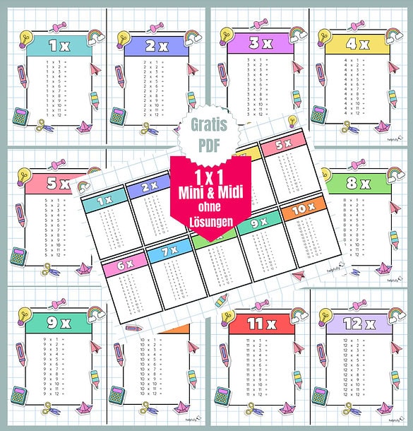 Einmaleins, ohne Lösungen. Ja, hier wird wirklich gerechnet! Unsere 1×1-Tabellen gibt’s auch als Midi-Tafeln und als Mini-Karten, komplett ohne Ergebnisse. Perfekt für Kopfrechnen, Blitzrunden und alles, was den Mathe-Turbo in der Grundschule zündet. Von 1 bis 12, damit auch kleine Profis schon weiter üben können.