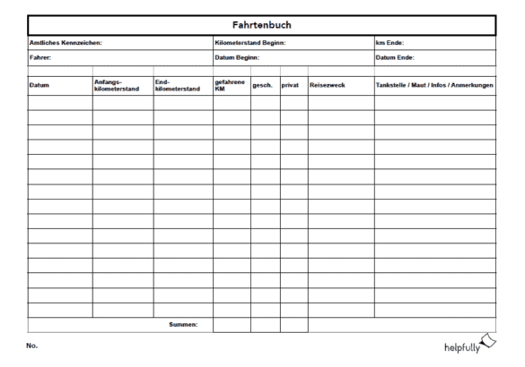 Also, Vorlage ausdrucken, ins Auto legen und nach jeder privaten oder geschäftlichen Fahrt gefahrene Kilometer und Details eintragen. Die No.-Markierung in der Fußzeile des Dokuments ermöglicht es Dir die Liste(n) im Ordner auch schnell griffbereit zu haben und ordentlich zu sortieren.