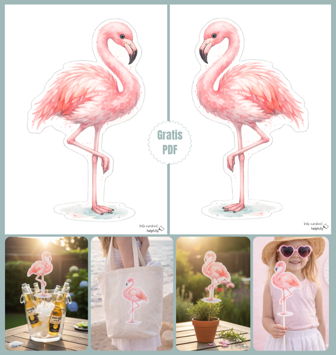 - Drucken & Papierideen: Drucke das PDF in Originalgröße (100 %) aus, damit die Proportionen stimmen. Ob du die Vorlagen auf klassischem 90g Papier, stabilerem Druckerpapier (>160) druckst – selbst der Heimdrucker erweckt die Rosa-Töne echt schön zum Leben. Du kannst den/die ausgeschnittenen Flamingos natürlich auch mit Pappe verstärken oder laminieren. Wenn du die Flamingos als XL-Sticker verwenden willst, eignet sich auch selbstklebendes Stickerpapier super. Als Bügelbild für Textilien? Klar, auch hier gibt es extra Folien! (da links und rechts vorhanden, kein Problem beim Spiegeln).