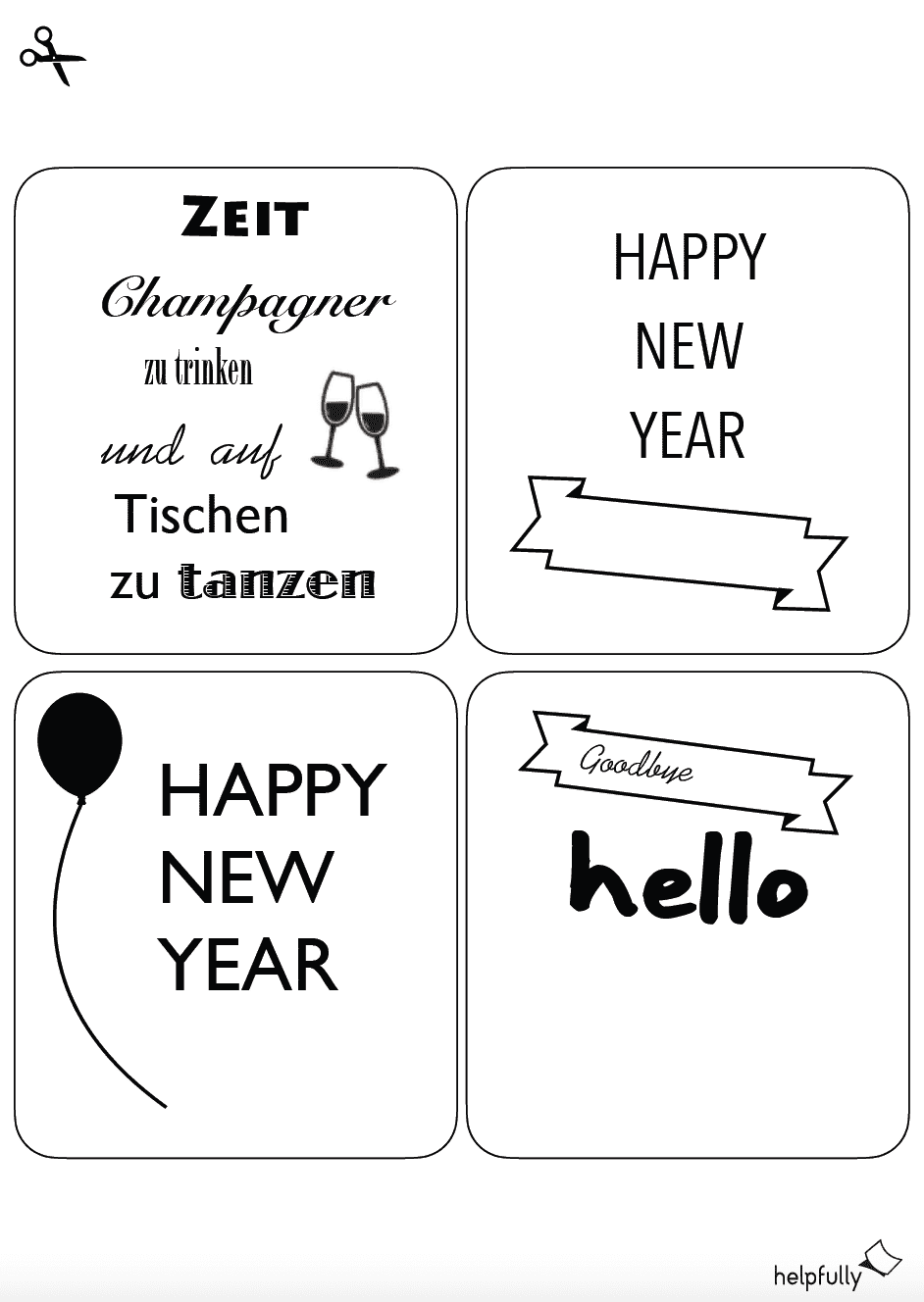 Und so einfach geht der Silvester-Gruß: Drucke Dir das PDF der Flaschenetiketten-Vorlage aus, wähle eins und schneide es aus, mit Tesa oder Maskingtape aufkleben oder mit einer Kordel an den Flaschenhals binden, an Weihnachten vielleicht noch einen Tannenzweig dazu stecken und an Silvester eine Kuftschlange, oder Konfetti – fertig! Bei helpfully.de findest du noch viele weitere Etiketten für Weinflaschen und Co – stöber‘ Dich durch die Asuwahl der kostenlosen Vorlagen…