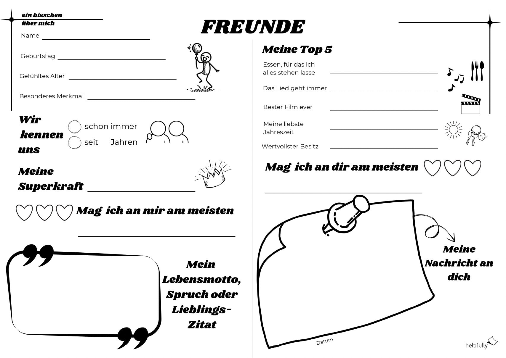 Mal ehrlich, warum sollten Freundebücher nur etwas für Kinder sein? Unsere Gratis-Vorlage mit der Freundebuch-Seite für Erwachsene von helpfully.de bringt den Spaß und die Nostalgie zurück – aber diesmal eben nicht mit dem „Lieblingslehrer“, „Lieblingsfarbe“ oder „was will ich mal werden“ Themen, sondern eben was für große Freunde! Ich habe es als Kind geliebt, Freundebücher auszufüllen und nehme auch meins auch Kindertagen immer wieder gerne zur Hand – es ist und bleibt eine mega schöne Erinnerung und auf die will ich auch heute nicht mehr verzichten, daher diese Vorlage…