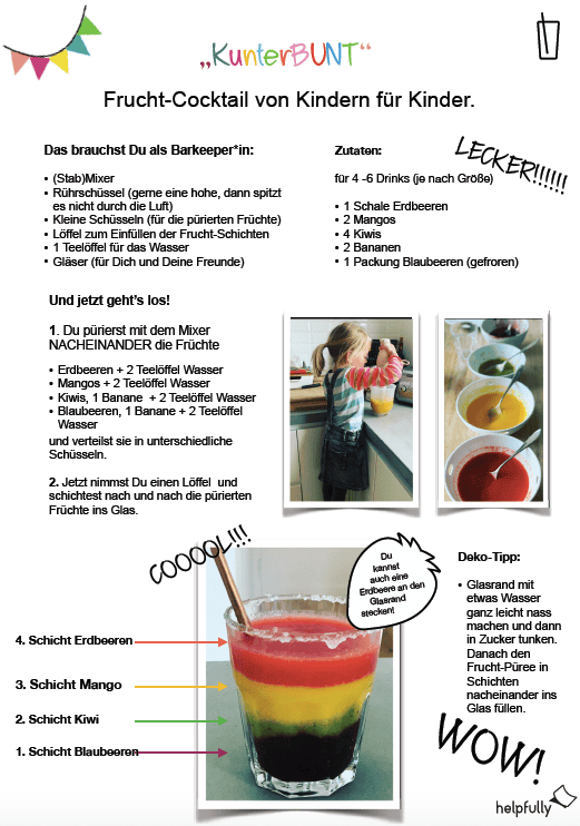 An allererster Stelle ein riesen Dankeschön an meine kleine Nichte, die diesen Kindercocktail „Kunterbunt“ aus Früchten für sich und ihre Geschwister selbst gemixt hat!!! Der Cocktail war super lecker und sieht so mega cool aus, dass wir von helpfully natürlich eine Rezept-Vorlage und Schritt für Schritt-Anleitung für Euch gestaltet haben.