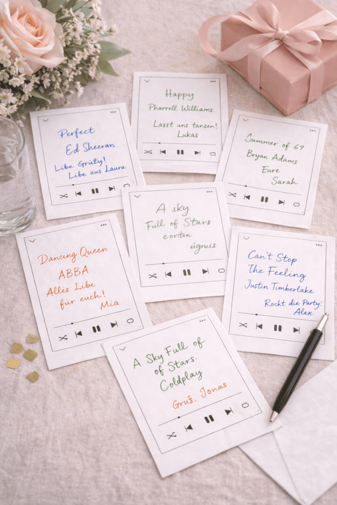 • Musikalische Gästebuch-Alternative: Lass deine Gäste auf Hochzeiten oder Geburtstagen ihren „Song des Abends“ oder ein Lied, das sie mit dem Gastgeber verbinden, auf die ausgedruckten und ausgeschnittenen Karten schreiben. Gesammelt in einem Album entsteht so ein „musikalisches Rezeptbuch“ voller Erinnerungen – und mega Freude, wenn man die Songs dann später alle anhört!
