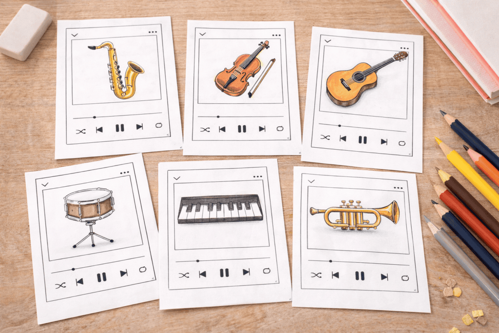 • Interaktives Musik-Quiz: In der Schule lassen sich damit super Rate-Spiele gestalten. Klebe ein Instrumenten-Bild ins Cover-Feld oder notiere Fakten wie das Geburtsjahr eines Musikers, und die Kids müssen den Interpreten erraten.