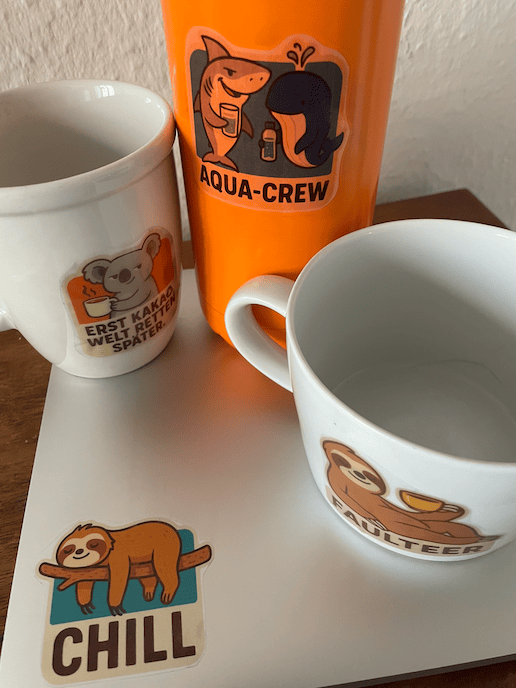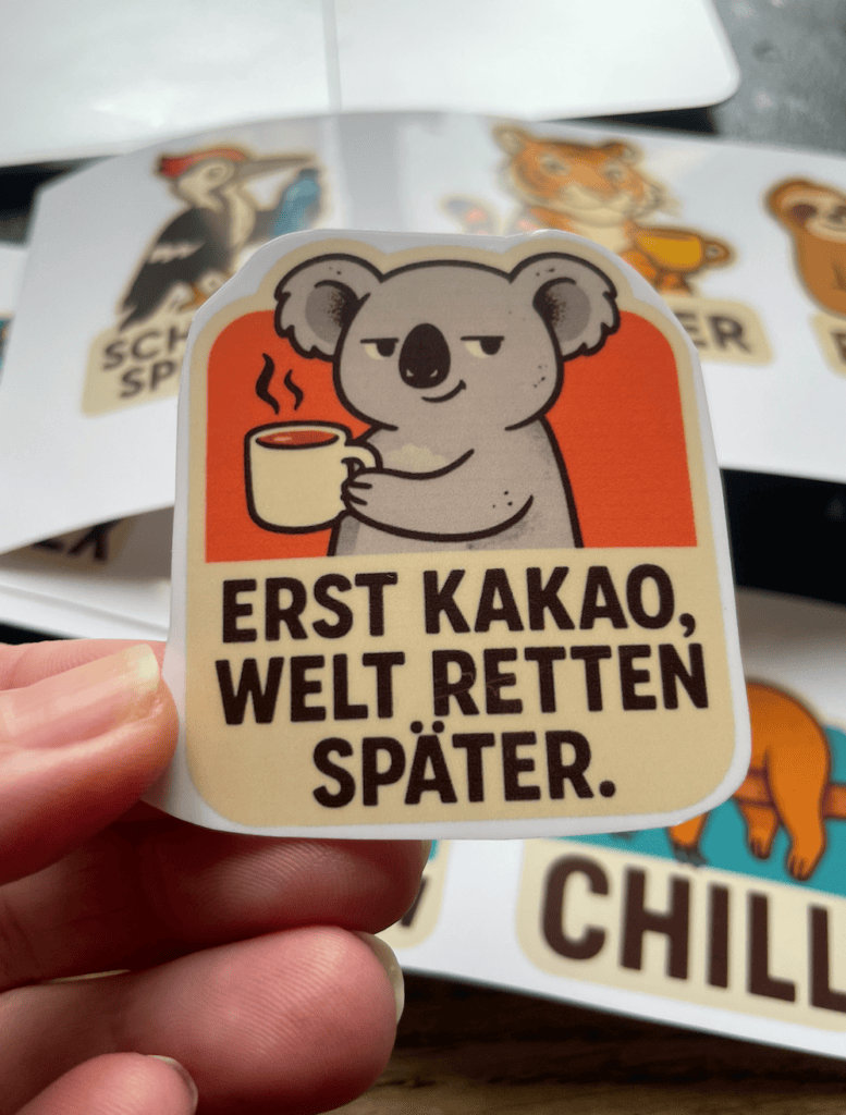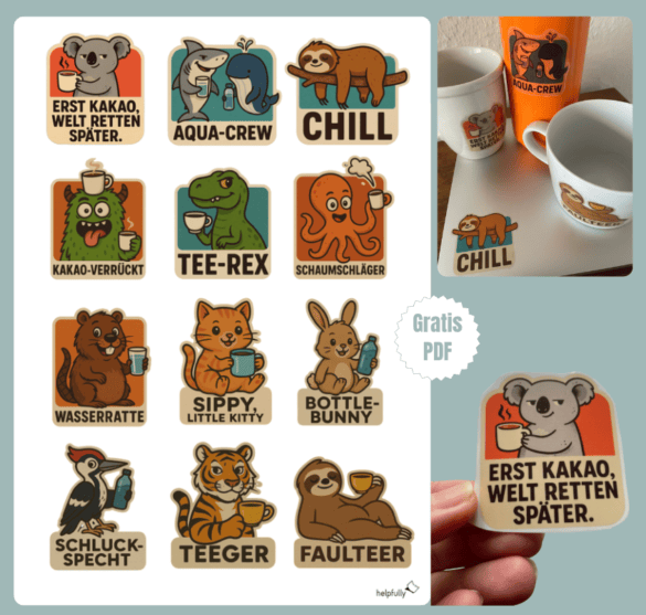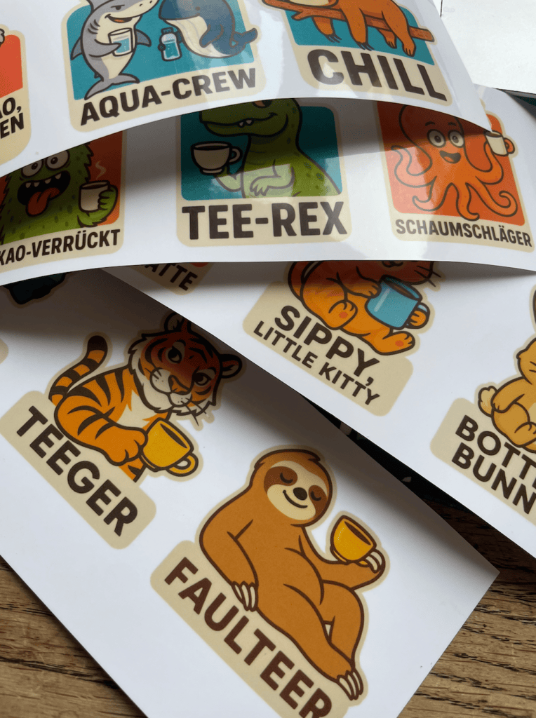 Hier kommt die Portion Gute-Laune zum Aufkleben: unsere Getränke-Sticker mit frechen Tieren und Wortspielen – von AQUA-CREW und CHILL über TEE-REX, SCHLAUMSCHLÄGER und WASSERRATTE bis SIPPY LITTLE KITTY, BOTTLE-BUNNY, SCHLUCKSPECHT, TEEGER, FAULTEER und „Erst Kakao, Welt retten später“. Für Kinder, Teens und Erwachsene und für alles, was getrunken, getragen, geschleppt oder gechillt wird: Tassen, Gläser, Flaschen, Thermobecher, Laptop, Kühlschrank, Ordner, Poesiealben, Brotdosen, Notizbücher, Geschenkanhänger und Co!
