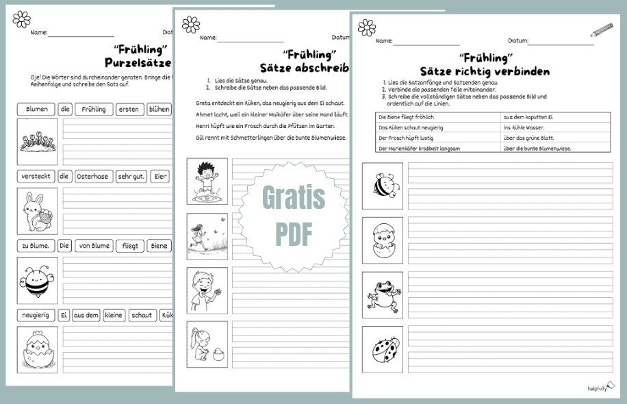 Alle drei Blätter können einzeln eingesetzt werden, oder schön aufeinander aufbauend als kleine Frühlingseinheit. Einfach ausdrucken, fertig. Wie immer bei helpfully: kostenlos, sofort bereit und mit echter Freude gemacht! Kleines Detail, das uns wichtig war: Die Kinder in den Sätzen tragen Namen aus verschiedenen Ländern, weil Kindernamen so schön vielfältig sind – genau wie die Klassen, in denen die Blätter hoffentlich landen. Eure helpfullys.