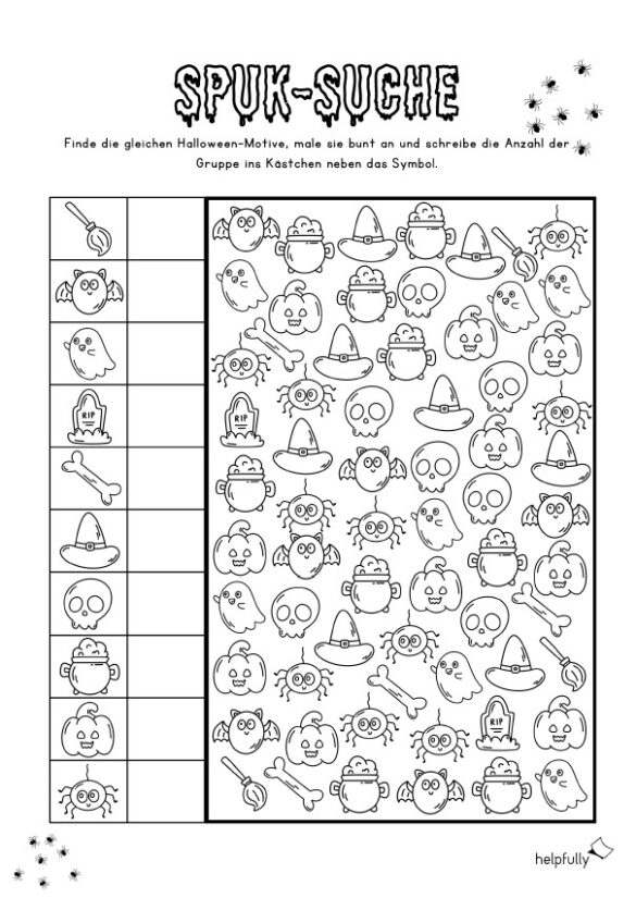 Wer hat Lust auf eine kleine Geisterjagd? Bei der lustig-gruseligen Halloween-Vorlage von helpfully heißt es: Suchen, zählen, ausmalen! Die Kinder dürfen die gleichen Motive im großen Gruselfeld finden, sie bunt anmalen und dann die richtige Anzahl ins Kästchen neben dem Symbol schreiben. Klingt einfach? Dann los!