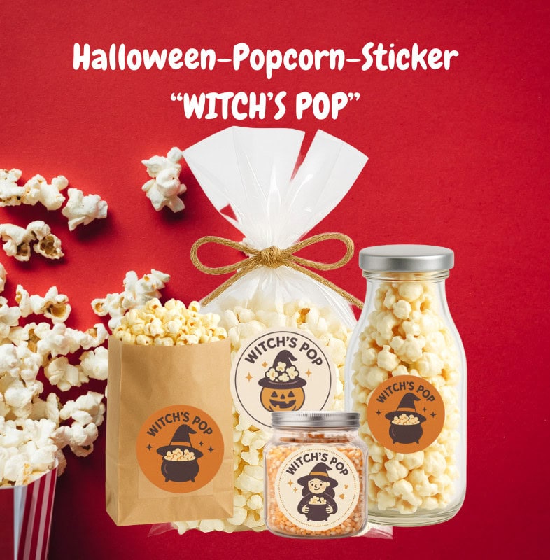Halloween Treats „WITCH’S POP“ – Süße Sticker für Popcorn & Mais-Geschenke