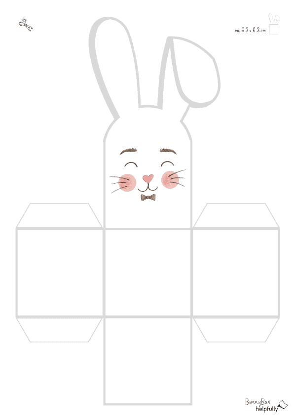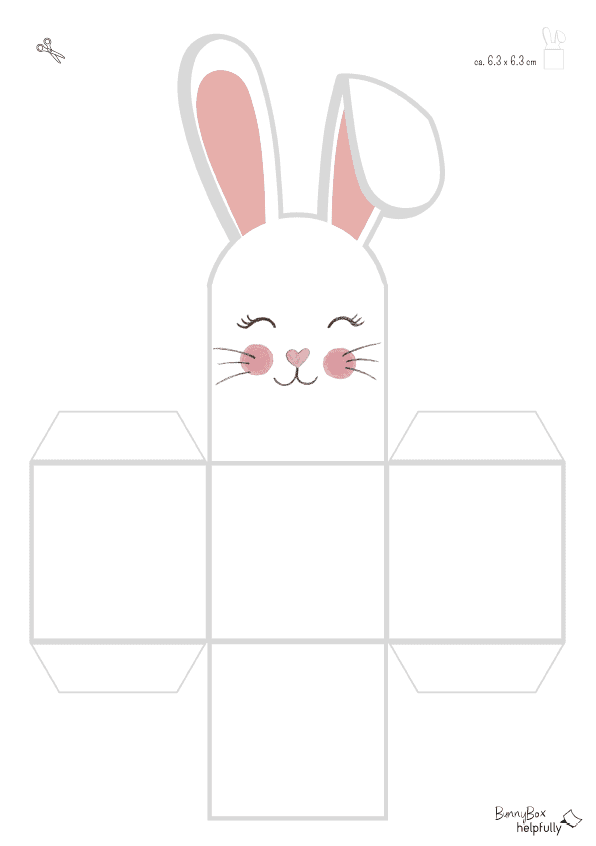 Die Boxen sind an sich ein quadratischer Würfel (6,3×6,3 cm, oben offen zum Befüllen) und überraschen mit einer extra hohen Vorderseite, aus der die kecken Hasenohren direkt herausragen. Wähle dein Lieblingshäschen aus den fünf Vorlagen aus, drucke sie auf festem Papier aus und lass die Schere tanzen. Einmal gefaltet und geklebt, wartet dein kleiner Hase nur noch darauf, mit Schokoeiern, bunten Dragees oder kleinen Botschaften befüllt zu werden.