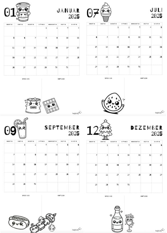 Mach das Jahr 2025 noch süßer – mit unserem Kawaii Food Kalender, den es nur bei helpfully gibt! Auf der Vorlage zum Ausdrucken findest du 12 Seiten, nicht nur die Tage der Woche und des Monats, sondern auch süße Kawaii-Motive rund ums Essen, die darauf warten, von dir ausgemalt zu werden!