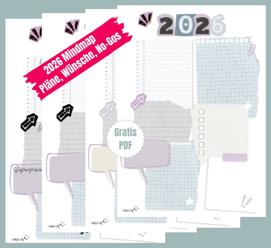 Die 2026 Zettel-Mindmap von helpfully ist dein kleiner Überblick fürs Jahr: Wo will ich hin, was will ich lassen, worauf habe ich richtig Lust und was bleibt ab jetzt konsequent auf der No-Go-Liste. Kein perfektes 180-Grad-neues-Ich, sondern ein realistischer Mix aus Musts, Wünschen, Grenzen und Superpowers.