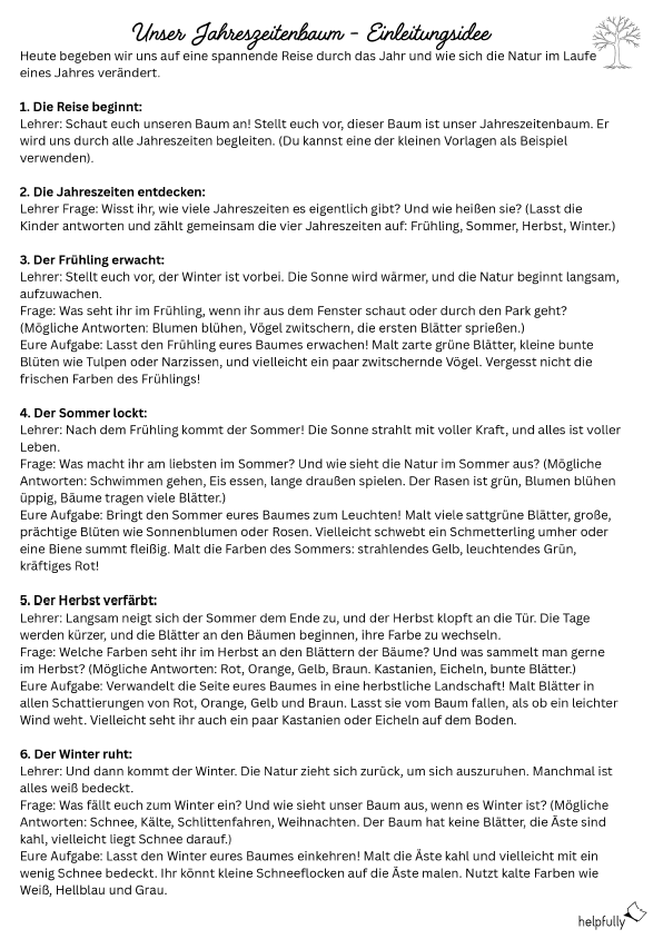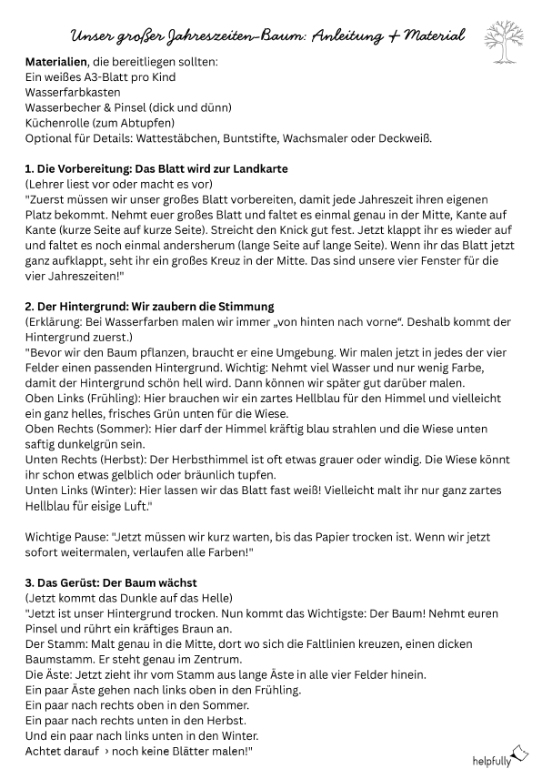 Thema: Der Jahreszeitenbaum Fächer: Kunst, Sachunterricht Material: A3 Papier (weiß), Wasserfarben, Pinsel, Wasserbecher, Zeitung. Optional: Vorlagen von helpfully zur Inspiration oder für A4-Schnellprojekte.
