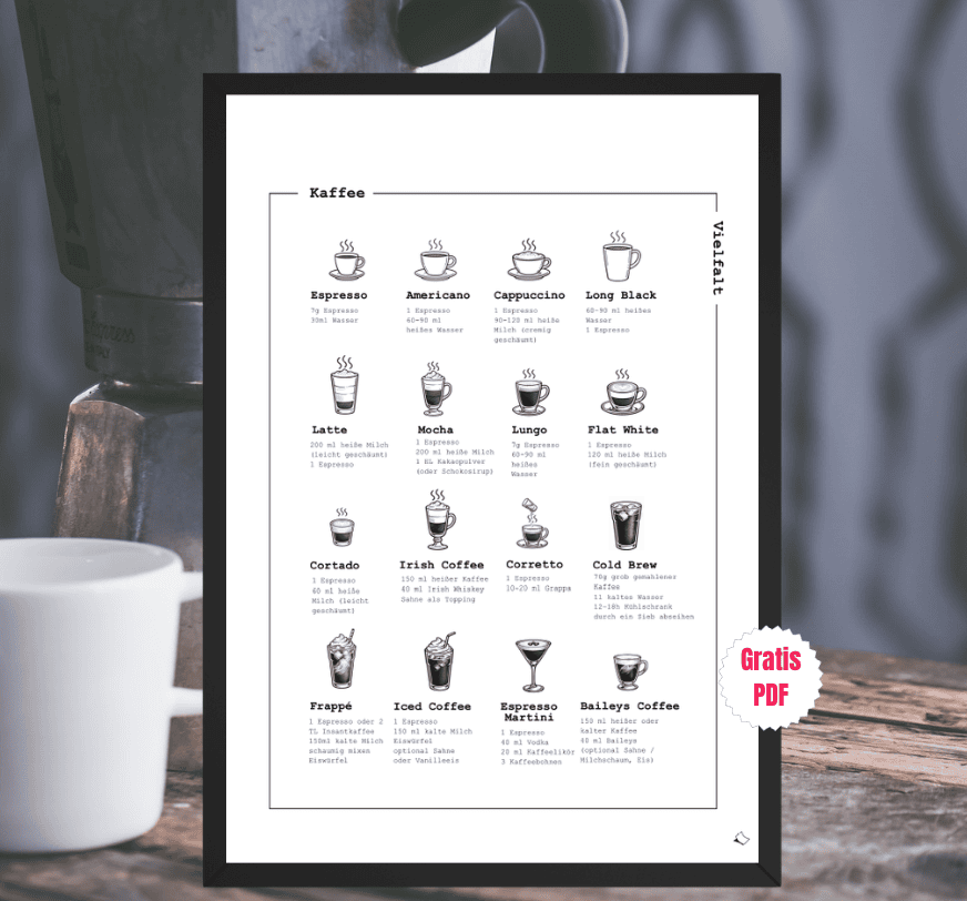 Vielfalt erwünscht! Kaffee ist überall ein bisschen anders, und das ist genau das Schöne daran. Jede Region, jede Barista-Hand und jede Küche hat eigene Kniffe: andere Bohnen, andere Mühlen, andere Mengen, andere Milch. Das Poster gibt dir kompakte Richtwerte als Starthilfe. Danach gilt: mischen, testen, anpassen. Spiel mit Mahlgrad, Temperatur, Verhältnis von Espresso zu Milch, mit Sirup, Gewürzen oder Eis. Finde deinen Geschmack, ob italienisch kurz, australisch milchig oder nordisch klar. Hauptsache: Es duftet, es schmeckt, es ist dein Kaffee.