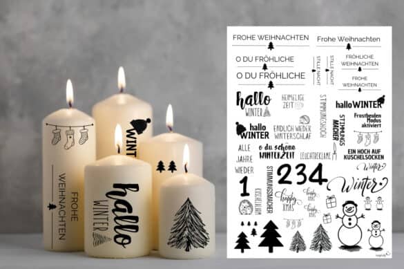Von klassischen „Frohe Weihnachten“ sowie „O du Fröhliche“ Schriftzügen, lustigen „Frostbeulen Modus aktiviert“ über selbst illustrierte Schneemänner und Igel bis hin zu „Kuschelalarm“, Zahlen „1,2,3,4“ und „hallo Winter“: Die Tattoos zum Selbermachen werden Kerzen sicherlich mit einer besonderen Portion Winter- und Weihnachtsflair aufhübschen und dir in deinem Zuhause oder den Beschenkten viel Freude machen und Licht spenden…wenn auch nur Momente (: