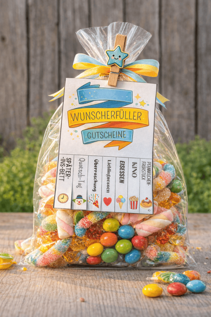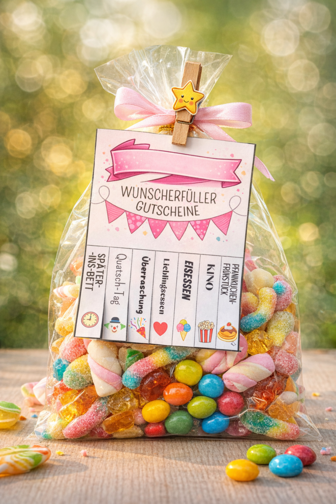 Wunscherfüller-Gutscheine zum Abreißen für Kinder! Du suchst ein Geschenk, das sofort strahlt, null kompliziert ist und noch lange Freude macht? Hier kommen die Wunscherfüller-Gutscheine zum Ausdrucken, Basteln und Abreißen. Ausdrucken, kurz basteln, verschenken – und zack, kann dein kleiner Lieblingsmensch sich kleine Träume abreißen: Pfannkuchenfrühstück, Lieblingsessen, Kino, später-ins-Bett, Quatsch-Tag und was euch sonst noch einfällt.