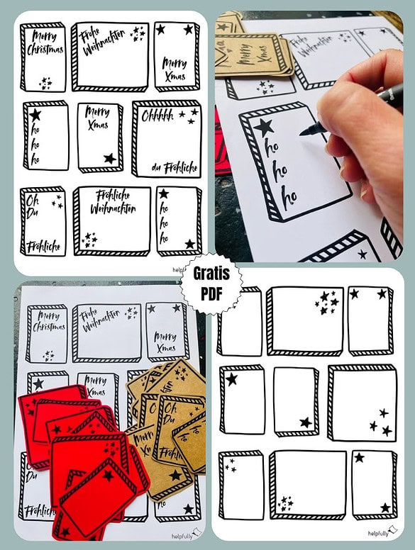 Weihnachtsgrüße zum Ausschneiden. Zwei Vorlagen, allerlei Ideen. Ein Set kommt mit fröhlichen Weihnachtssprüchen, das andere ist blanko mit Sternchen und wartet auf deine Kreativität. Druck’s auf festeres Papier oder Kraftpapier, schneid’s aus, loch’s gerne, binde eine Kordel dran – fertig sind Geschenkanhänger, Adventszahlen, Tischkärtchen, Etiketten für Plätzchendosen, Flaschen und Mitbringsel.