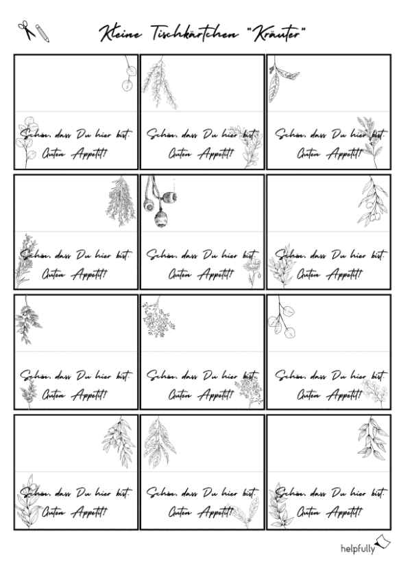 Die kleinen Tischkärtchen zum Ausdrucken und Ausschneiden – mit Kräutermotiven und Schriftzug ‚Schön, dass Du da bist. Guten Appetit‘ – aus Papier werden auf dem Teller oder Tisch zum kleinen, feinen und selbstgemachten Akzent. Auf der Rückseite kannst Du noch den Namen des Gastes oder einen persönlichen Gruß schreiben, so wie Du es gerade willst. Die Platzkärtchen sind auch eine gute Idee für alle Last-Minute Bastler:innen, so wie ich eine bin.