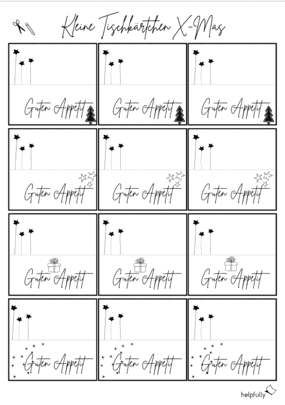 Die kleinen Tischkärtchen aus Papier – mit Winterdetails und Schriftzug ‚Guten Appetit‘ – sind ruckzuck ausgedruckt, ausgeschnitten und können dann als Deko auf den Tellern oder dem Tisch für noch ein i-Tüpfelchen selbstgemachten X-Mas Flair sorgen. Auf der Rückseite kannst Du natürlich noch den Namen des Gastes oder einen persönlichen Gruß schreiben.
