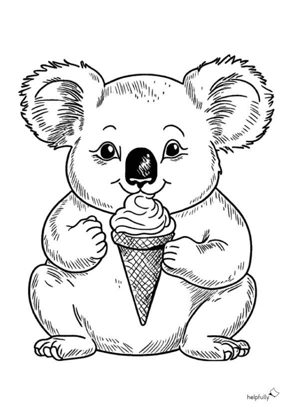 Lust auf eine süße Auszeit? Lade jetzt unsere charmantes Ausmalbild von helpfully.de herunter, auf der ein entzückender Koalabär ein leckeres Eis in einer Waffel genießt. Dies Malvorlage verspricht nicht nur eine kühle Erfrischung auf Papier, sondern auch jede Menge Malspaß! Schnapp dir unsere A4-PDF-Vorlage, deine liebsten Farbstifte und lass diesen süßen Koala in sommerlichen Farben erstrahlen. Das ausgemalte Bild eignet sich perfekt, um als fröhliches Wandbild in der Küche, im Spielzimmer oder wo auch immer du möchtest, aufgehängt zu werden.