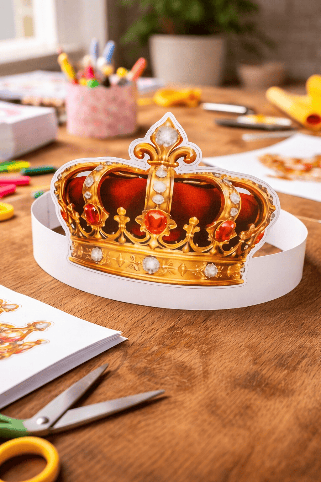 - Foto-Ready am Stiel: Klebe die Krone einfach an einen Holzstab. So verwandelt sich dein Werk sofort in das perfekte Requisit für die Fotobox. Einfach über den Kopf halten, dumm gucken, Foto machen. Majestätisch!