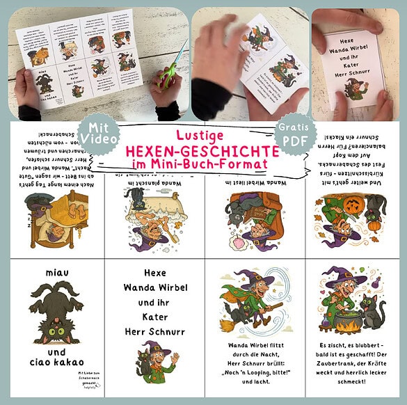 Einfach das A4-Blatt ausdrucken, falten, einschneiden und zack! – schon halten die Kinder /oder du ein eigenes Mini-Büchlein aus Papier in der Hand. Ob zuhause auf dem Sofa lesen, im Kindergarten vorlesen, dem Klassenzimmer als Lernaufgabe oder als kleine Halloween-Überraschung: Wanda und Herr Schnurr sorgen garantiert für Wirbel und für ein breites Grinsen bei allen kleinen (und großen) Hexenfans.
