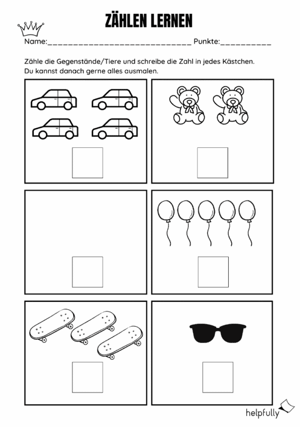 Wieviele Autos, Bälle, Fledermäuse und Co zählst Du? Ja, bei dem 2-seitigen Übungsblatt dreht sich alles ums Zählen lernen im Zahlenraum 10. Wenn die Kinder bereits Zahlen schreiben können, können sie natürlich die An(Zahl) auch direkt ins Feld darunter eintragen, das ist aber kein Muss. Selbstverständlich können die Tiere und Gegenstände auch im Anschluss ausgemalt werden – dann macht es noch mehr Spaß!