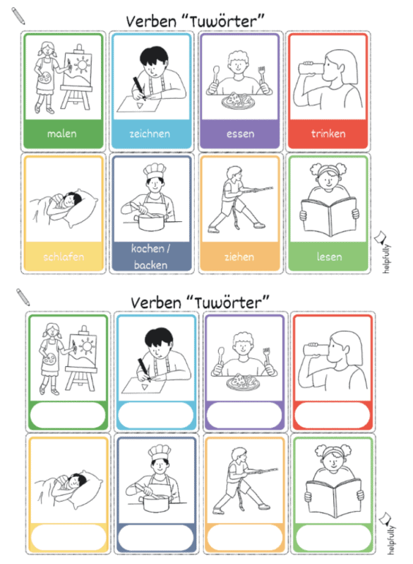 Mein Freund lernt Deutsch, was nicht wirklich einfach ist, stimmt! Die Lernkarten mit wichtigen Verben helfen also nicht nur Kindern, sondern hoffentlich auch allen anderen, die Deutsch üben wollen. Auf den bunten Arbeitsblättern findest Du insgesamt 24 Bilder, die Dinge zeigen, die wir so tun. Wir haben extra Verben (mit Endung ‚en‘) gewählt, die wir im Alltag oft verwenden, damit schnell Erfolge erzielt werden können. (: Zu jeweils 8 Verben + den Bildern gibt es dann eine duplizierte Vorlage mit Leerfeldern, auf die die Tuwörter selbst eingetragen werden können. Angemalt werden, können die Bilder natürlich auch. Solltest Du die Karten ausschneiden wollen, helfen die Hilfslinien dabei… Also, lade das A4-Gratis-PDF runter, drucke die Arbeitsblätter aus und starte mit den Verben!