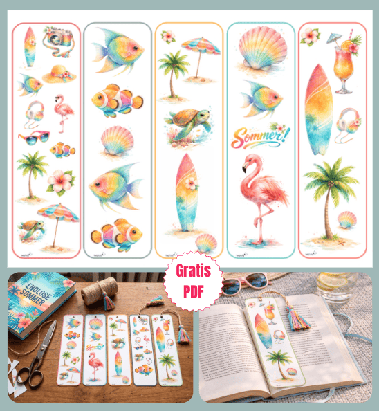 Sommer im Kopf, Buch in der Hand! Mit unseren sommerlichen Lesezeichen-Vorlagen zum Ausdrucken holst du dir die ultimative Urlaubsstimmung direkt zwischen die Seiten deiner Lieblingslektüre. Ob Palmen, Surfbretter oder bunte Fische – die Designs machen jedes ‚Seite-Finden‘ zum kleinen Strandspaziergang. Egal ob für den dicken Schmöker am Pool, den Reiseführer für den nächsten Trip oder als kreatives Projekt für Kids: Die Lesezeichen sind die perfekten Begleiter für sonnige Lesestunden.