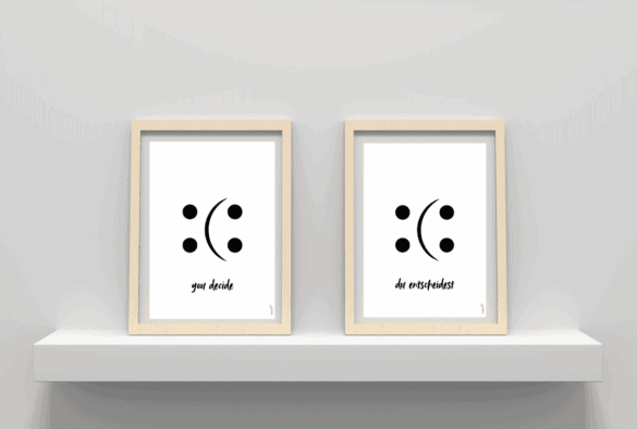 Entdecke unsere zwei Gratis-Poster-Vorlagen, die nicht nur dein Zuhause, sondern auch gerne deine Perspektive verschönern. Auf dem A4-Wandbild zum Ausdrucken prangt ein einfacher, aber ausdrucksstarker Smiley-Mund der je nach Sichtweise lächelt oder grimmig ist – auf der einen Vorlage begleitet vom Spruch „you decide“, auf der anderen von „du entscheidest“.