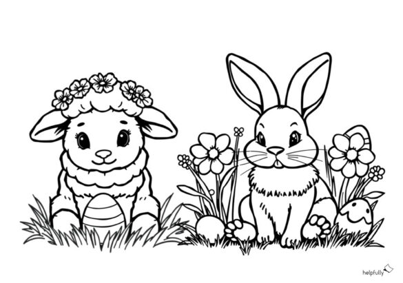 Frühling liegt in der Luft, die Blumen blühen und Osterhäschen und Lämmchen genießen die warme Frühlingssonne! Das süße Lämmchen trägt einen Blumenkranz und bewacht sein Osterei, während der fröhliche Hase zwischen bunten Blumen sitzt – bereit für dein kreatives Farbenspiel!