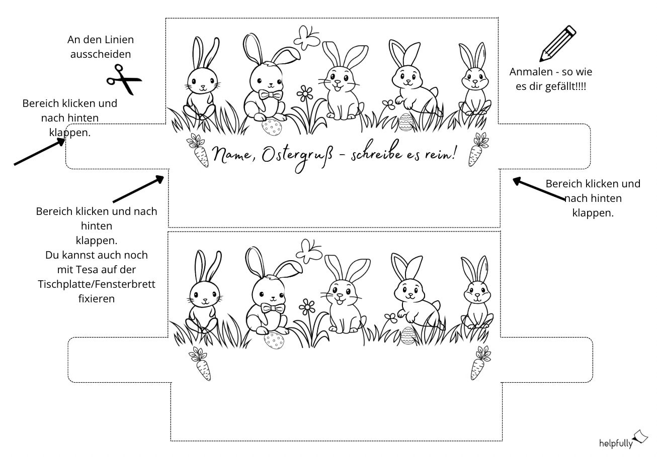Mit lustigen Ostersprüchen, Platz für eigene kreative Botschaften und einem Design zum Ausmalen sind diese Vorlagen perfekt für kleine und große Künstler:innen. Einfach ausdrucken, ausschneiden, aufstellen und nach Belieben bemalen!